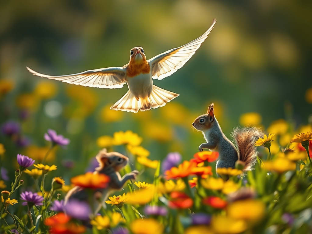 Zburând deasupra câmpurilor verzi, Cântec privea cu uimire la marea de culori care o înconjura. Flori sălbatice, în nuanțe de galben, violet și roșu, dansau în bătaia vântului, iar copacii, îmbrăcați în frunzișul lor proaspăt, păreau să o invite la o sărbătoare. În acel moment, Cântec își luă avânt și începu să cânte, iar melodii dulci se răspândiră în aer ca un parfum de primăvară.