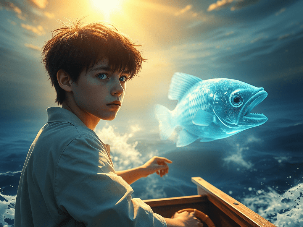 Bătrânii din sat vorbeau despre un pește legendar, cunoscut sub numele de „Peștele Albastru”, care trăia în adâncurile celei mai misterioase părți a mării. Era un simbol al înțelepciunii și al adevărului suprem, dar nimeni nu reușise să-l prindă vreodată. Luca, fascinat de aceste povești, își făcea tot mai des planuri să plece în căutarea acestui pește, convins fiind că el ar putea aduce răspunsuri la întrebările ce îl frământau.