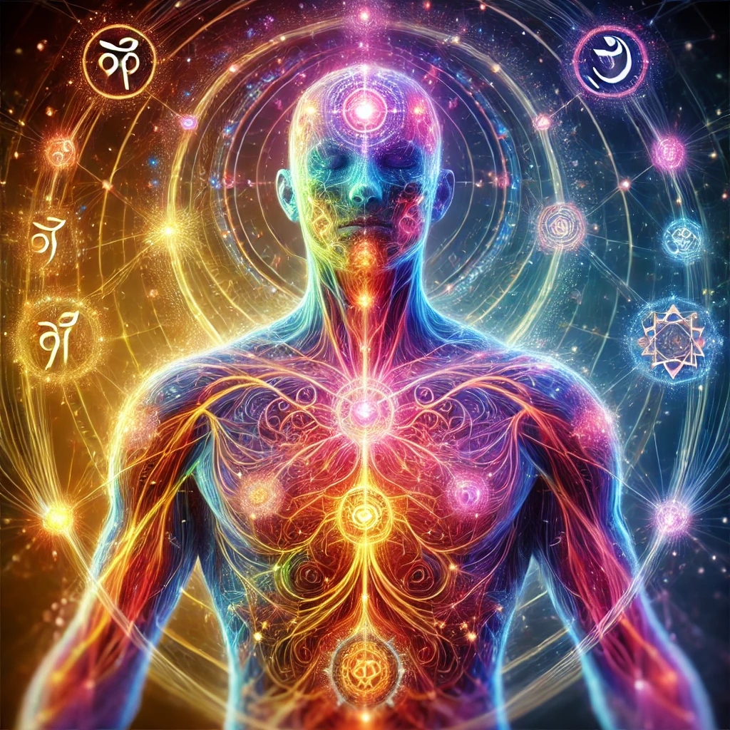 BodyGraph Human Design: Reprezentarea detaliată a fluxului energetic și a elementelor spirituale, subliniate prin iluminare subtilă care pune în evidență complexitatea și unicitatea sistemului