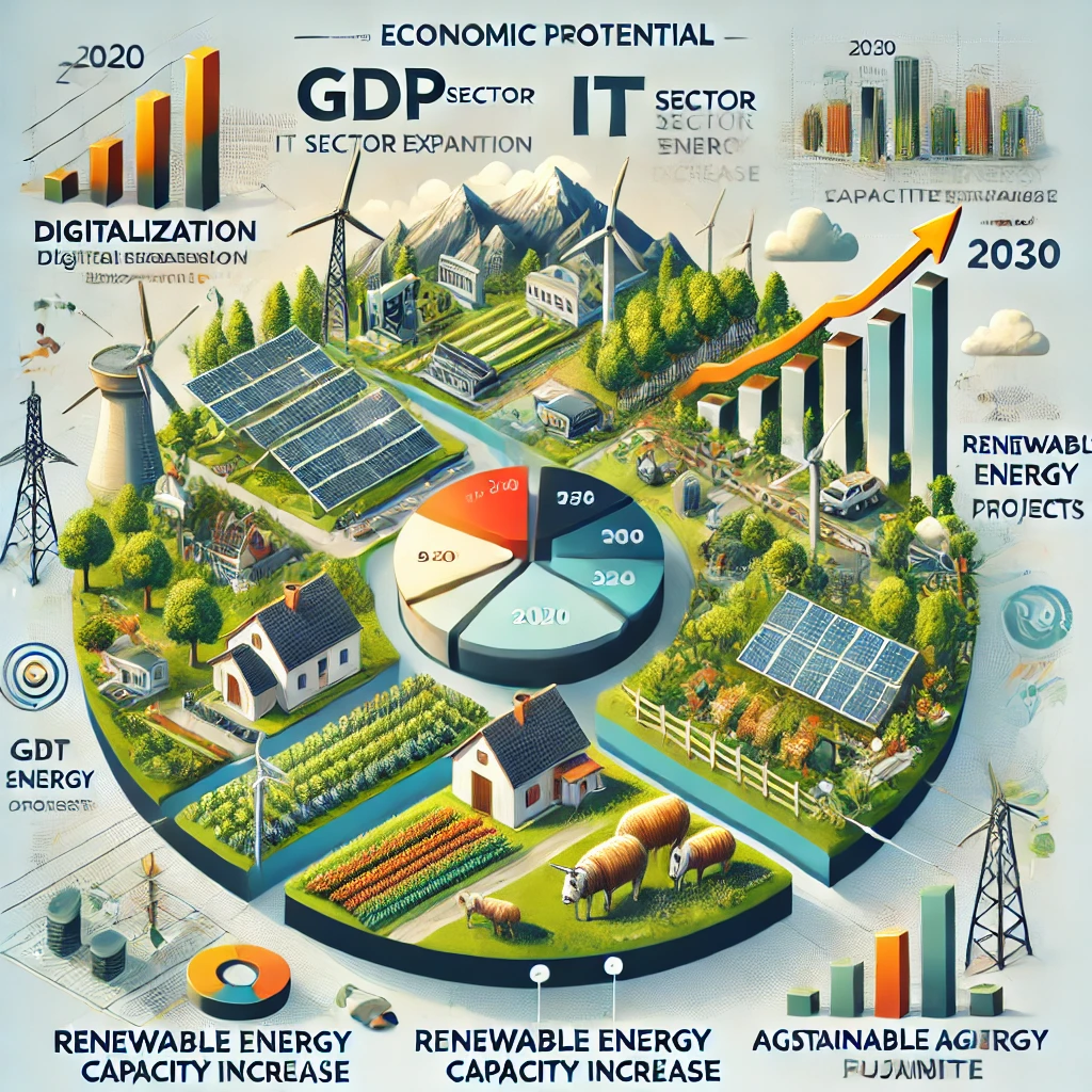 România ar putea înregistra o creștere economică moderată, de 3-4% anual în următorul deceniu. Conform previziunilor Comisiei Europene, economiile din Europa Centrală și de Est vor experimenta o creștere stabilă în perioada 2024-2030, cu o expansiune susținută în sectoarele digitale și ecologice, unde România are un potențial semnificativ de dezvoltare. În special, investițiile în infrastructura de transport și în energii regenerabile vor contribui semnificativ la impulsionarea PIB-ului. În plus, țara se află pe o traiectorie favorabilă pentru a deveni un hub de inovație și tehnologie. În acest context, unele studii susțin că România are potențialul să devină un lider regional în domeniul tehnologic, datorită resurselor umane bine pregătite și cererii mari de soluții digitale în cadrul economiilor din Uniunea Europeană (1).
