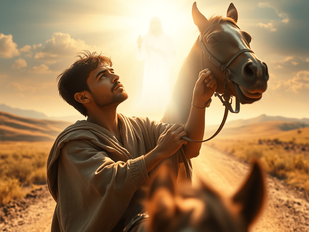 În timp ce Saul călătorea, o lumină orbitoare l-a copleșit din senin, iar călărețul a căzut de pe calul său, neputincios. O voce puternică, dar blândă, a străbătut întunericul: „Saul, Saul, de ce mă prigonești?” Saul, cuprins de groază și confuzie, a strigat: „Cine ești, Doamne?” Iar vocea i-a răspuns: „Eu sunt Isus, pe care tu îl prigonești. Dar ridică-te și intră în cetate; ți se va spune ce trebuie să faci.” (Faptele Apostolilor 9:4-6).