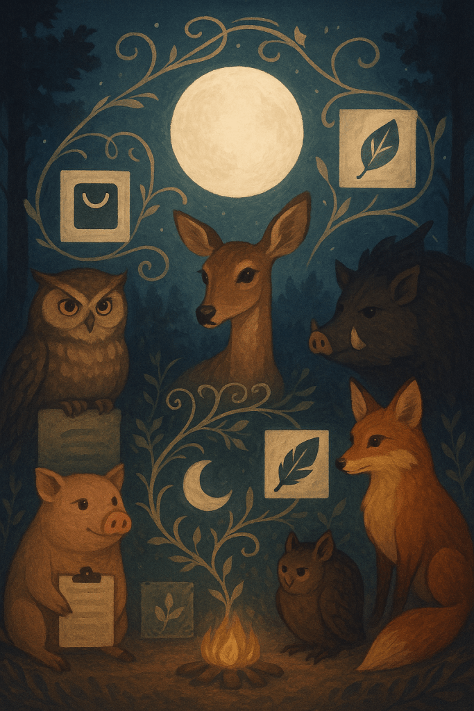 În inima Pădurii Cântătoare, unde vântul adia cu melodii seculare și foșnetul frunzelor păstra secretele vremurilor trecute, animalele au fost chemate la o Adunare de Lună Plină. După multe sezoane în care conducerea era unilaterală și hotărârile se luau doar de Marele Lider, a venit momentul schimbării. Sub claritatea luminii lunii, toate viețuitoarele din pădure au hotărât să creeze Consiliul Speciilor — un organism comun, cu un reprezentant din fiecare specie, care să ia deciziile împreună, cu respect și răbdare, pentru a asigura armonia și echilibrul Pădurii Cântătoare.