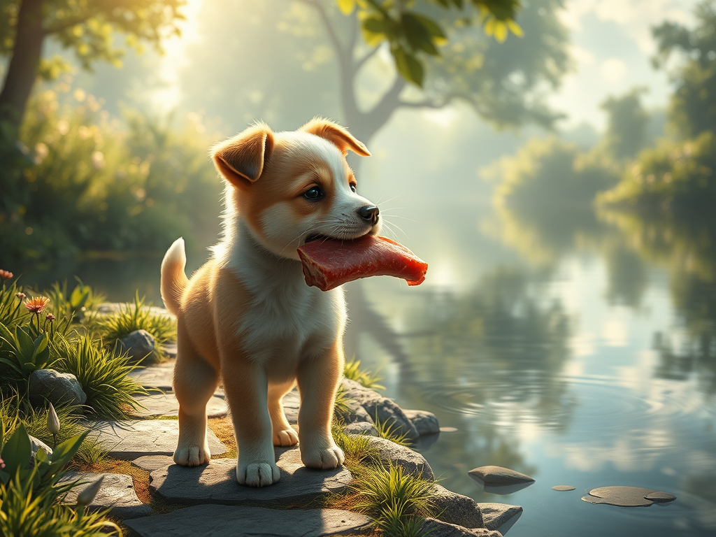 A fost odată un căţeluş jucăuş care găsise o bucată delicioasă de carne. Era tare fericit și mergea pe o potecuță, cu carnea în gură, să o mănânce în liniște.