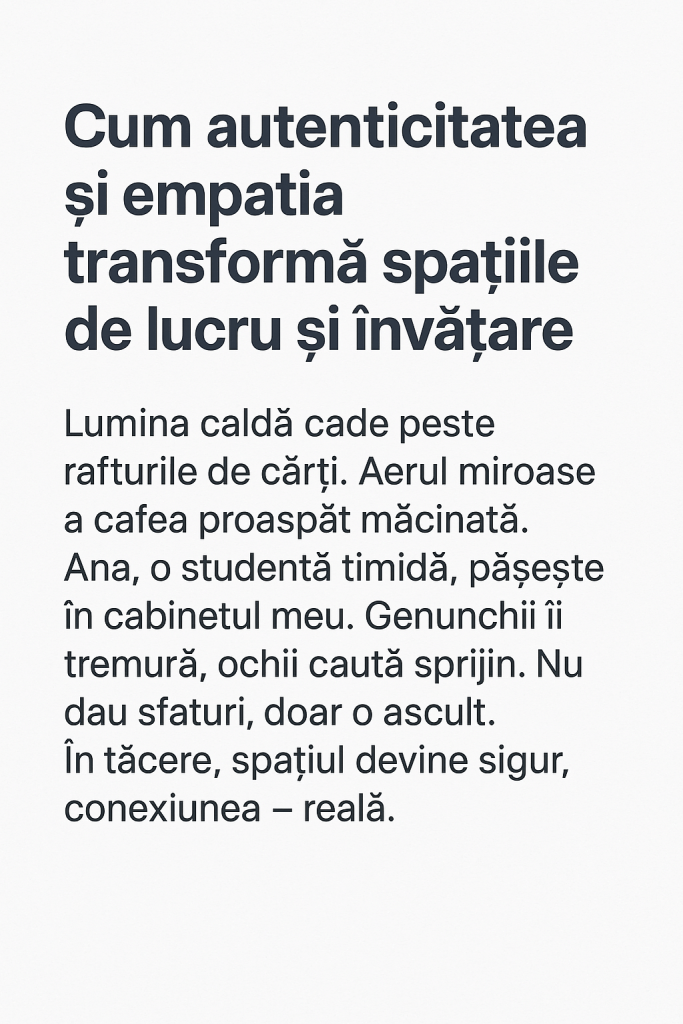 - Autenticitatea și autoacceptarea sunt fundamentale pentru dezvoltarea personală. Fiecare individ, dacă este ascultat fără judecată și sprijinit, poate să-și descopere potențialul și să se apropie de sinele său autentic.