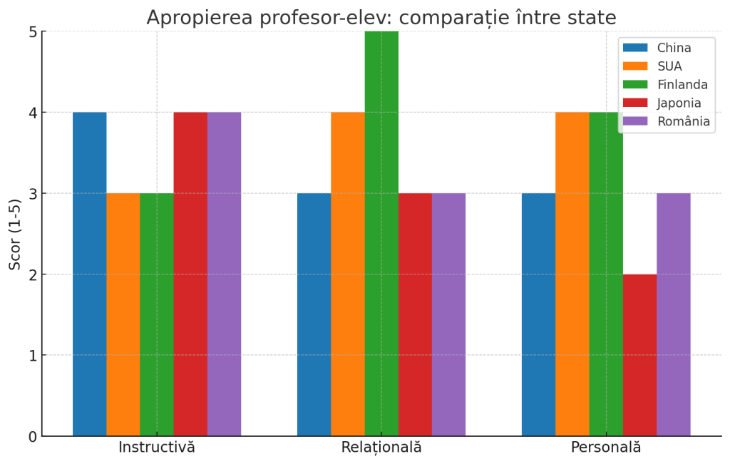 Graficul comparativ ilustrează modul în care diferite sisteme educaționale pun accent pe diverse dimensiuni ale apropierii profesor-elev. Se observă că Finlanda excelează la dimensiunea relațională, promovând egalitatea și colaborarea în clasă, în timp ce SUA acordă importanță atât relației, cât și dimensiunii personale, prin interactivitate și empatie. China și România au profiluri similare, cu accent pe claritatea instructivă și un nivel moderat al sprijinului relațional. În schimb, Japonia menține o apropiere mai redusă la nivel personal, dar rămâne puternică în zona instructivă, datorită tradiției educaționale formale.